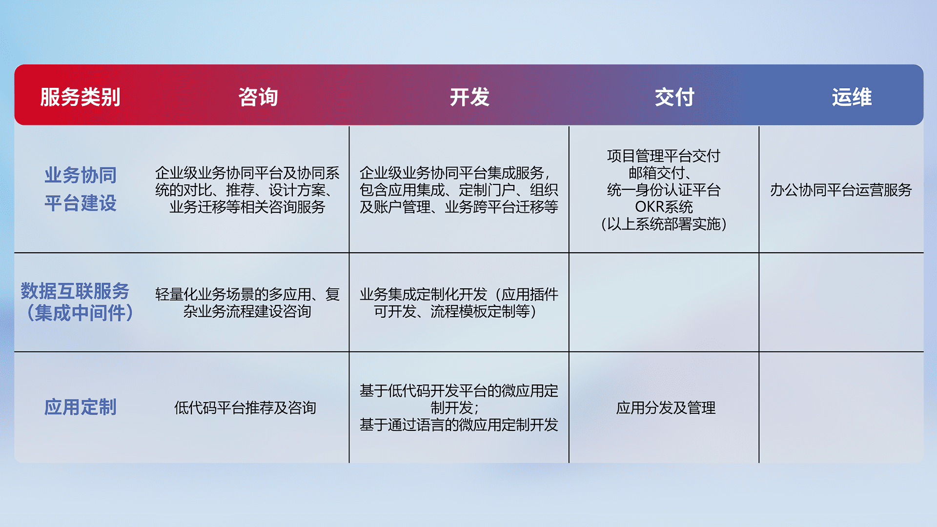 针对钉钉、、、、企微、、IDaas等平台级产品提供产品的规划、、方案、、交付、、、定制化开发等服务,,实现如统一协同办公、、、智能客户服务、、、混合会议管理、、、、智能数据查询、、等业务场景,,实现数字化转型。。。。