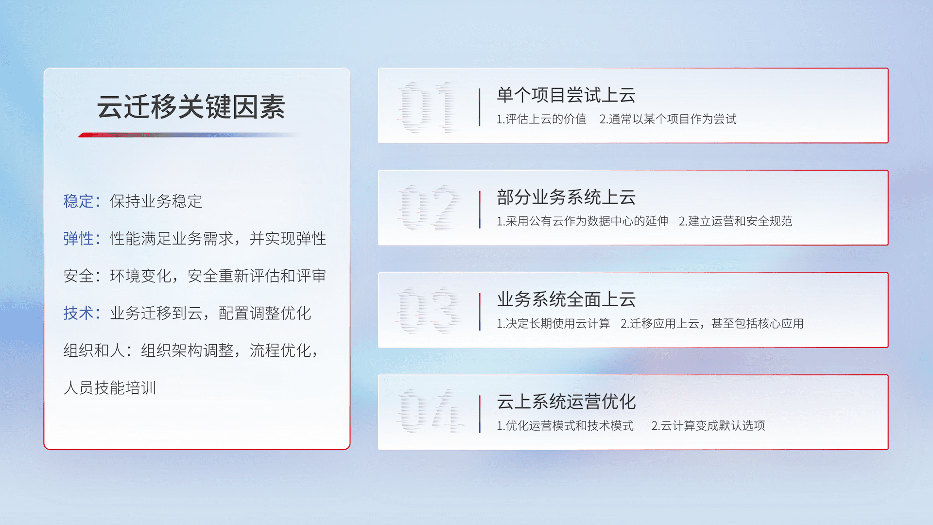 结合实际业务,,,,从规划设计、、、、云平台选型、、云原生改造、、数据迁移、、集成交付,,迁移全过程为客户识别最佳上云路径,,做好风险识别管理,,,设计网络架构、、、、身份权限、、、、安全审计合规、、、、操作审计、、、日志审计、、、监控告警策略、、、多站点容灾设计等,,对云上基础设施进行整体规划,,,提升IT治理水平,,,,以满足弹性、、高可用、、高性能的需求。。