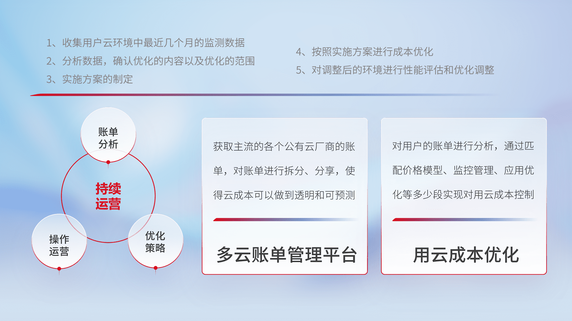通过多云纳管,,,,以统一的资源数据模型把客户的云资源进行抽象和封装,,,进而实现对多云资源的统一操作,,,保障云资源管理的可靠性、、、、稳定性与可用性。。。。量身定制化运维内容,,,,配置、、、开发运维、、补丁管理、、、备份、、、监控、、、认证和访问管理、、、、审计和日常巡检等,,,,保障在用云过程中的可靠度,,,,稳定度以及高可用率。。。